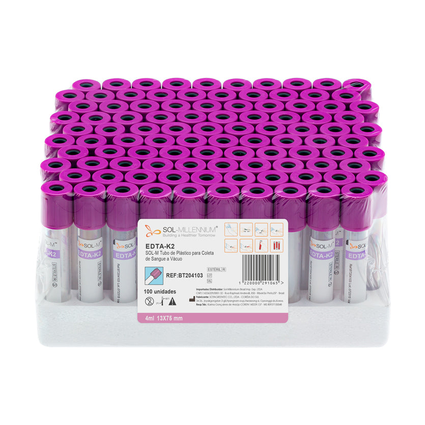 Tubo para coleta de sangue a vácuo com EDTA K2, plástico Polietileno Tereftalato, incolor, estéril, dimensão 13x75mm, volume de aspiração de 4ml. Tubo não siliconizado, rolha de borracha siliconizada, com tampa plástica protetora na cor roxa.